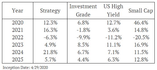 Performance is based on returns for the Ewing Morris Select Credit Fund LP. Inception date of the strategy is April 29, 2020. As of May 1, 2025 returns are based on Class P, net of fees and expenses. Class P units bear management fees of 0.75% per annum, as well as performance fees, as applicable. From February 1, 2025 to April 30, 2025, returns presented were those of Class S of the Fund, which bear management fees of 0.5% per annum, as well as performance fees, as applicable. Between April 29, 2020 to January 31, 2025 returns are based on a separately managed account, which shared a similar investment objective and strategy as the Ewing Morris Select Credit Fund LP and were calculated net of fees and expenses matching that of Class P. While the Fund’s overall investment objective remains the same, its past performance is not indicative of future performance, and the inclusion of management fees. Where the performance period is longer than 12 months, returns are annualized. 2020 represents the return since inception of the Fund to December 31, 2020. The High Yield Benchmark is represented by the iShares U.S. High Yield Bond Index ETF (CAD-Hedged). The Investment Grade Benchmark is represented by the iShares Canadian Corporate Bond Index ETF. Small Cap is the Russell 2000 Total Return Index. Strategy returns are based on an initial separately managed account, which shared a similar investment objective and strategy to the Select Credit Fund.