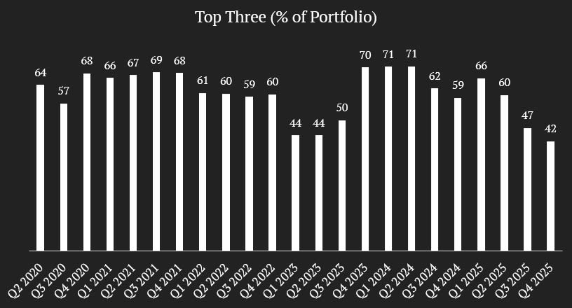 Since 2020, this patience, urgency and conviction has resulted in an exceptionally focused portfolio, where the strategy's top three ideas have comprised the majority of the portfolio.